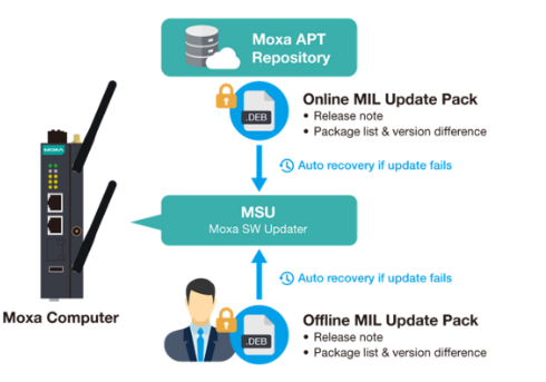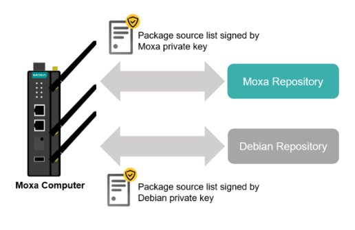 MIL は、APT を利用した安全な OTA(Over-the-Air)パッケージ更新に対応しています。パッケージの取得元は、Moxa および Debian の GPG 署名によって検証され、真正性と完全性が確保されます。
