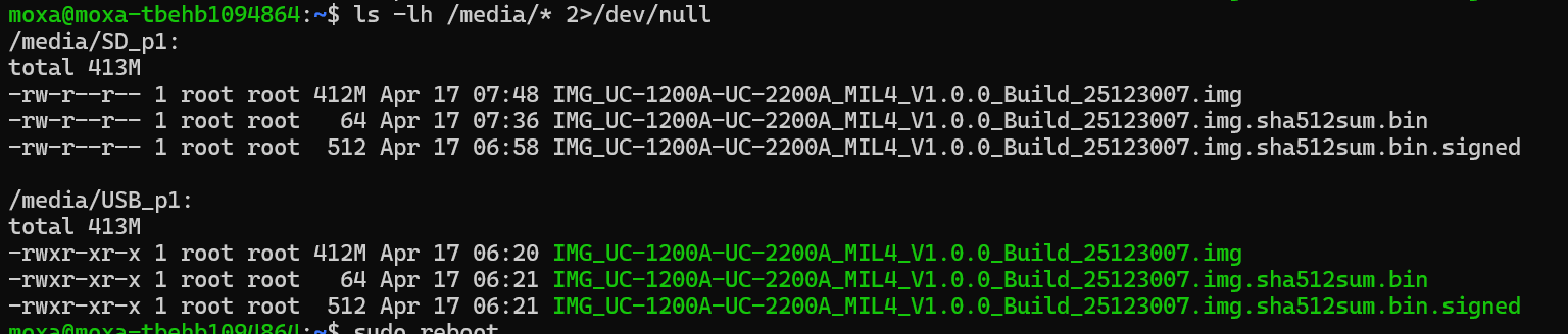 moxa@moxa-tbehb1094864:~$ sudo mx-bootloader-mgmt image_auto_install -d SD -f IMG_UC-1200A-UC-2200A_MIL4_V1.0.0_Build_25123007.img |