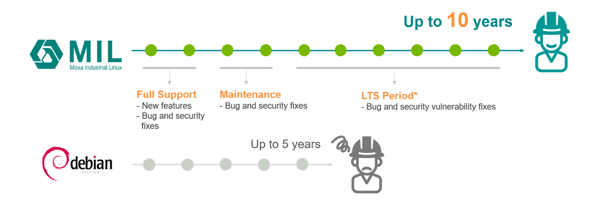 さらに、MIL にはセキュリティパッチとバグ修正を含む 10 年間のサポートが標準で付属しています。これは Debian 標準の 5 年サポートの 2 倍に相当し、追加費用なしで利用可能です。そのため、システム全体の保有コストを大きく抑えることができます。加えて、Moxa は The Linux Foundation® と Civil Infrastructure Platform(CIP)プロジェクトのメンバーとして、より安全で信頼性が高く、持続可能なプロジェクト運用を支えています。