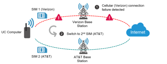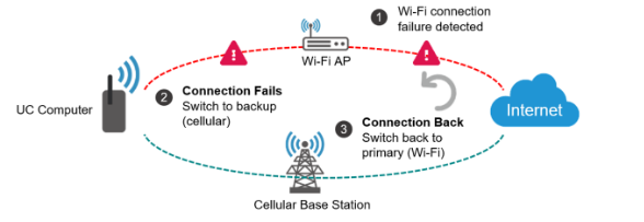 複数のバックアップ用インターフェース(Ethernet、Wi-Fi、セルラー)を設定しておくと、接続に問題が発生した際に、MCM がインターフェースの優先順位設定に従って自動的にフェイルオーバーを実行します。さらに、接続が復旧すると自動的にフェイルバックします。