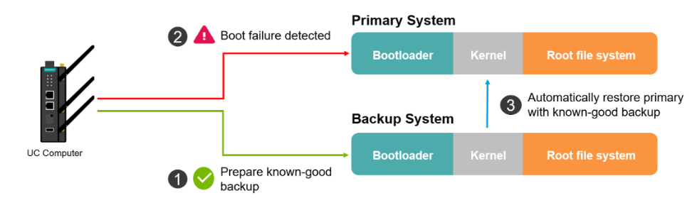MIL には自動システムフェイルバック機能が備わっており、重要なアップデート中の停電や、重要ソフトウェアへの不正な変更によって Secure Boot が失敗し、システムが起動できなくなった場合でも、直近の安全な正常動作状態へシステムを復元します。