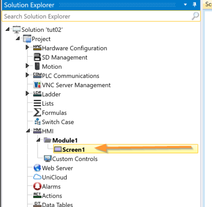 今回UniLogicから画面を作成してみます。HM→Module1→Screen1をクリックします。