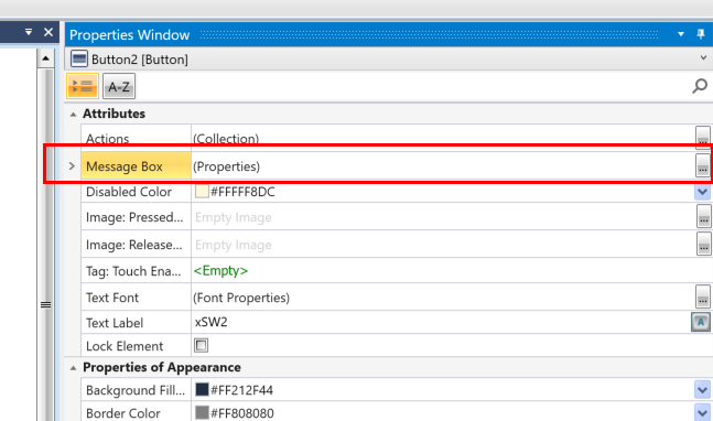 Implementation3は画面にメッセージボックスを追加します。それにより、ボタンなど動作する前の再確認POPUP画面を表示するようにできます。ボタンのProperties Window→Message Boxにある…ボタンをクリックします。