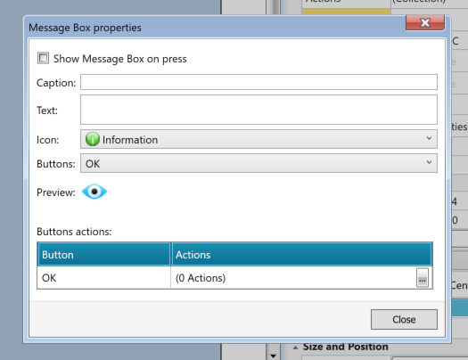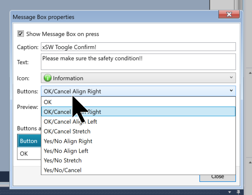 ButtonのDrop-listから該当するメッセージボックスに表示するボタン項目を設定します。