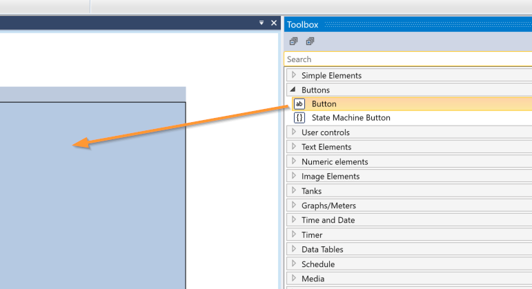 最初は画面に簡単なボタンを追加します。Toolbox→Buttons→Buttonをクリックします。