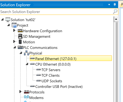 Project→PLC Communications→Physical→Panel Etherentをクリックします。