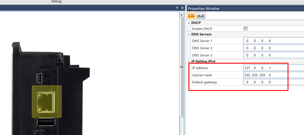 Properties WindowからデバイスのIPアドレスを設定できます。