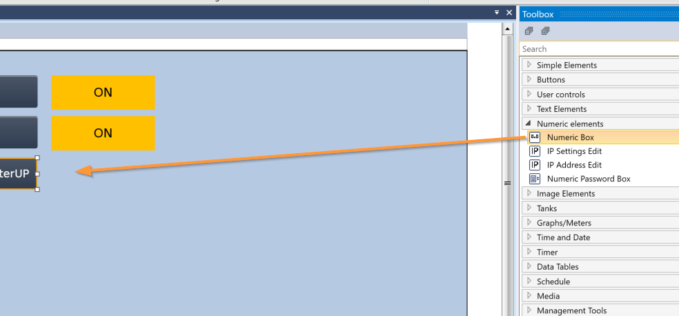 次は数字表示を追加してみます。Toolbox→Numeric elements→Numeric Boxを画面にDropします。