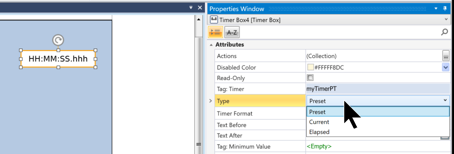 Properties→TypeにはTimer変数の表示項目を設定できます。